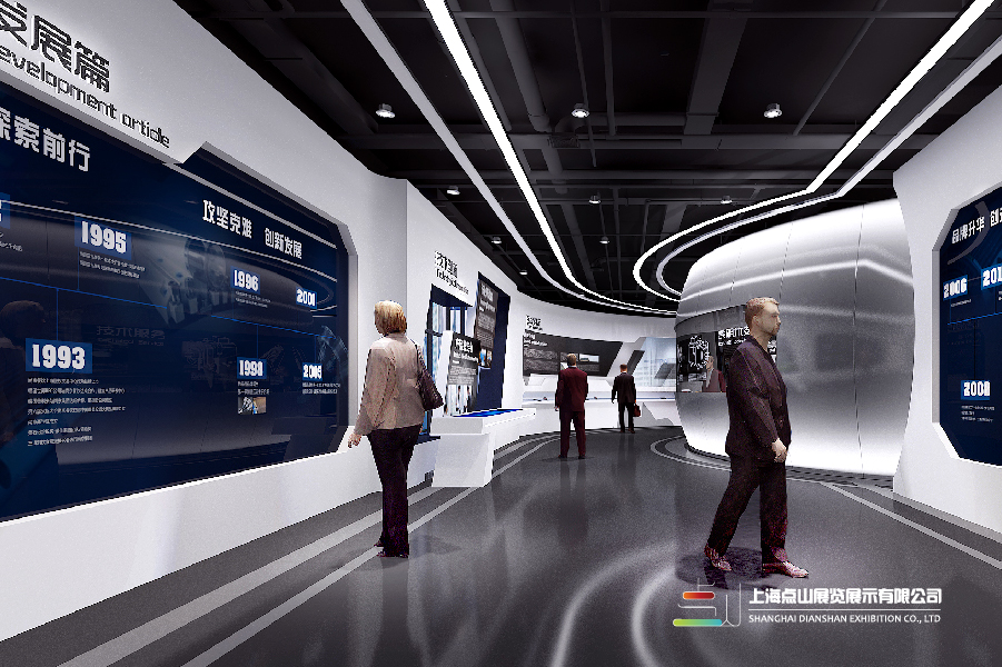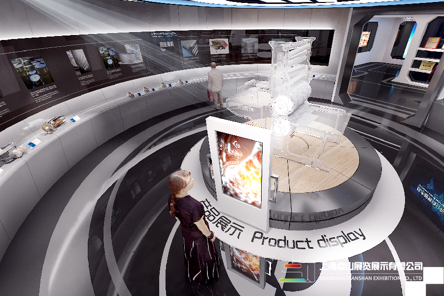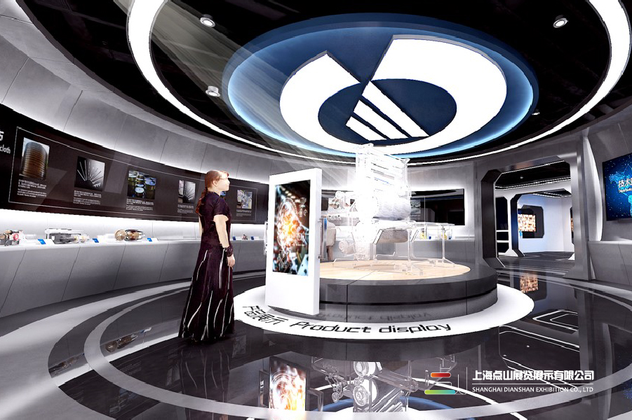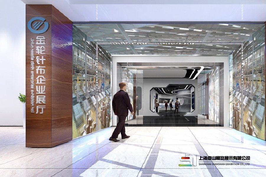 展廳包含金輪企業文化篇、發展篇、技術創新篇、服務篇、成果篇和未來篇共6個篇章。設計師汲取企業logo、企業產品以及跟產品相關的織線為主要元素,是整體的空間更加豐滿生動。其中服務篇是整個展示空間中的重中之重,我們在整體造型上結合企業產品的特性及造型,將其打造成相對圍合的獨立空間,凸顯企業核心的地位,呈現科技力量凝聚一體的強大氣場。現場采用針布機實物和多媒體結合展示,可以讓參觀者直觀感受梳理器材發揮的核心作用。