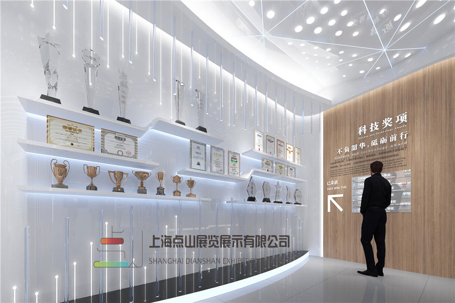 展廳包括企業文化篇、發展篇、研發成果篇、和未來愿景篇。設計師汲取企業LOGO、企業文化并結合了藥品研發特性等相關元素,使整個空間充滿靈動、科技和未來感。其中展廳中的研發樹藝術裝置,由藥品化學元素組成,視角由上至下寓意科研萃取藥素精華,視角由下至上也寓意上藥能量樹,生根于土地,生生不息。點亮了整個展廳,參觀者互動留影,傳遞帶走上藥精神。