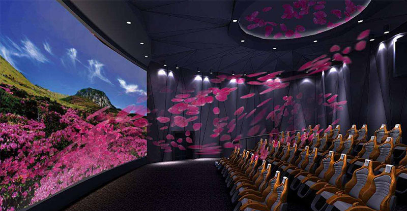 4D影院是從傳統的3D影院基礎上發展而來,具有主題突出、科技含量高、效果逼真、畫面沖擊性強等特點和優勢。人們不僅將震動、墜落、吹風、噴水、撓癢、掃腿等特技引入3D影院,還根據影片的情景精心設計出煙霧、雨、光電、氣泡、氣味等效果,觀眾在觀看4D影片時能夠獲得視覺、聽覺、觸覺、嗅覺等全方位感受,形成了一種獨特的體驗。