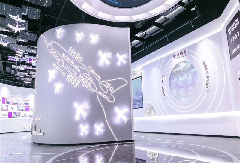 新落成的展示廳是[點山展示]設計并施工完成,設計以虛擬登機口為入口,涵蓋了發展歷程、藍圖擘繪、企業文化、企業風采、社會責任、可持續發展、領導關懷、未來展望等板塊,其展示形式和設計效果得到了領導的高度贊揚。