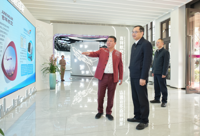 3月8日,上海市委常委、浦東新區區委書記李政參觀考察{點山展示作品)”吉祥航空展廳“展廳呈現的科技創新技術給予高度評價.
